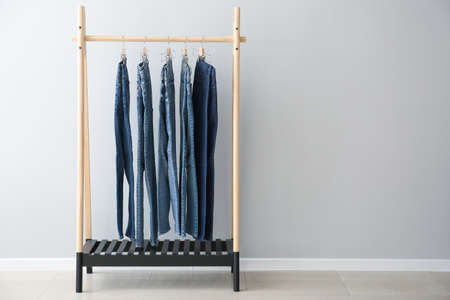Clothes rack with stylish jeans pants near light wall