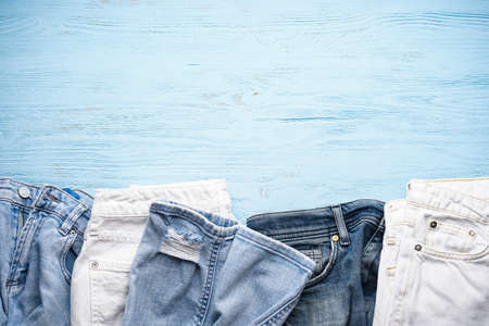 Vertical row of fashionable different jeans on a wooden background with copy space