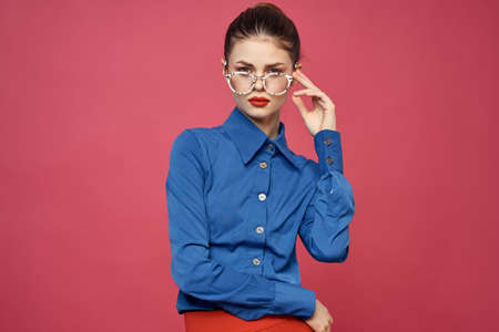 Portrait of a woman in glasses and in a blue shirt red lips pink background model