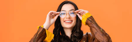 panoramic shot of stylish woman touching glasses isolated on orange