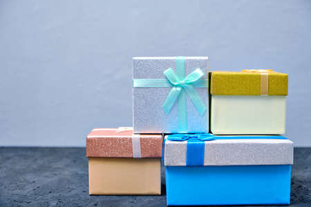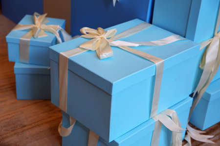Beautiful and bright gift boxes on a blue background. The concept of the celebration.