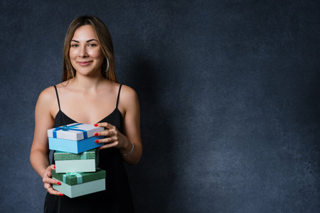 Christmas concert. A young woman in a black dress with gift boxes on a dark background. copy space