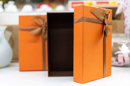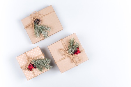 Holiday gift delivery service. Top view of red paper boxes tied up with white cord.