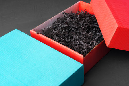 view from above. Open gift box on gray suede background. Next to it is the lid of the box