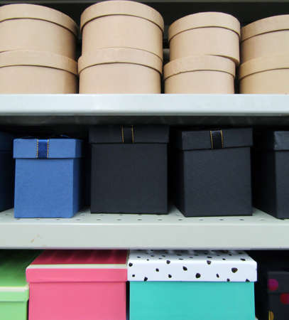 decluttering and tidying up conceptual still-life, white storage boxes to sort between objects to keep and those to declutter or donate with respective labels