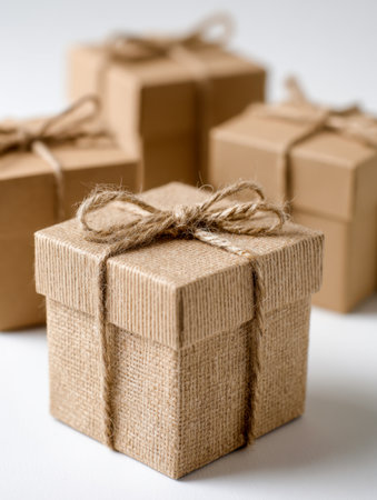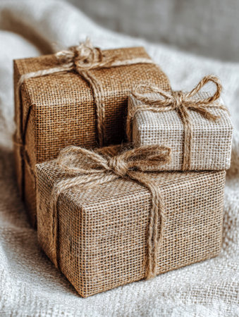 Warm-toned gifts adorned with rough burlap and simple twine sit atop a soft, textured cloth, perfect for heartfelt, eco-conscious holiday festivities.