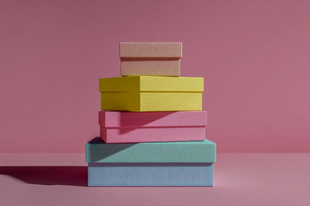 A tidy arrangement of five colorful, textured gift boxes showcases soft pastel hues of blue, teal, pink, yellow, and peach, set against a gentle pink backdrop, perfect fo
