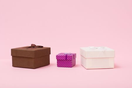Different size and color gift boxes on the pink background. Celebration day concept.