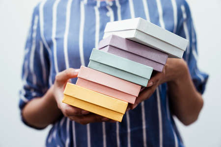 Close up woman on blue shirt holding colourful small boxes with two hands.