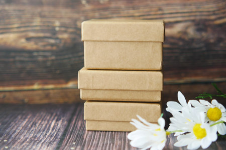 Brown Gift box wrapped in recycled paper on wooden table, happy new year and christmas holliday.