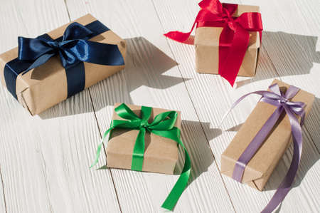 Christmas gift boxes with red ribbons on white wooden table. Christmas background.