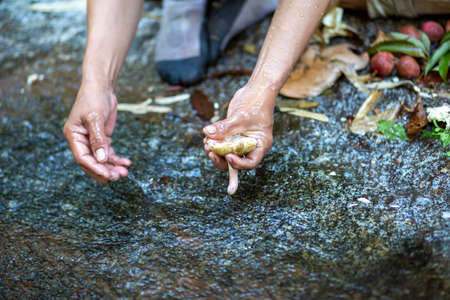 Wild mushrooms are being washed in natural streams. Forest seekers for food ingredients and send them for sale, living a life-saving self