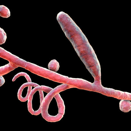 Fungus Sporothrix schenckii, the causative agent of sporotrichosis, especially common in florists and gardeners. 3D illustration showing fungal hyphae and spores