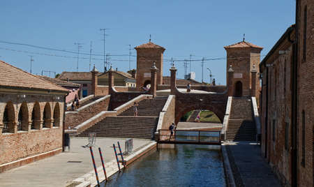Comacchio - Ferrara, Italy - August 13, 2021: Famous Tre Ponti or Trepponti three way bridge in Comacchio.