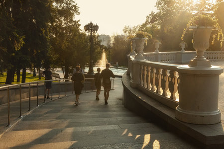 People walk in city park in Kharkiv, Ukraine