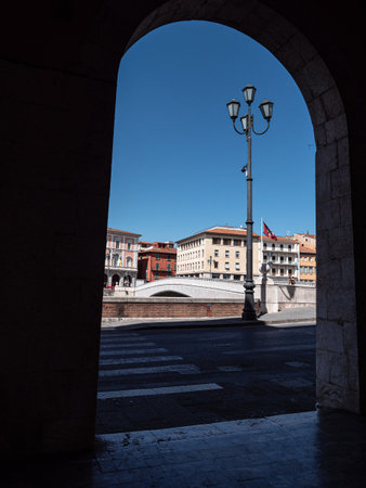 View from inside a Loggia with Arches of some Houses Along the Arno River in Pisa, Tuscany - Italy.