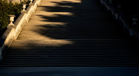 A wide, grand stone staircase leading upwards, bathed in warm sunlight that casts patterned shadows across the steps. The scene features classic stone urns on the balustrades and conveys a sense of ascent, history, and architectural elegance.