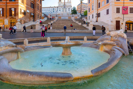 Rome, Italy - October 10, 2020: 18th century Spanish Steps in Piazza di Spagna and baroque Fountain of the Boat (Fontana della Barcaccia)