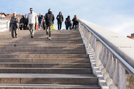 VENICE, ITALY - OCTOBER 11, 2016: tourists go over bridge in living district of Venice. The city has about 50,000 tourists a day and only around 55,000 people resided in the historic town