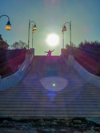 Lens flare next to silhouette of a dancing statue at the top of steps in Italy