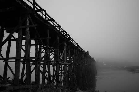 Landscape of famous wood bridge (Mon Bridge) in misty morning at Sanklaburi, Thailand