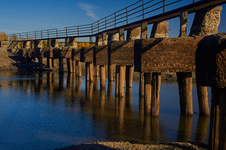 Railway bridge over the river, an old construction from the early 20th century. Protva River, Kaluzhskiy Region, Russia