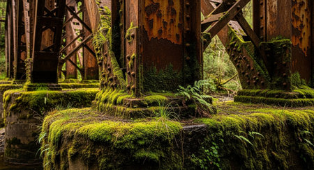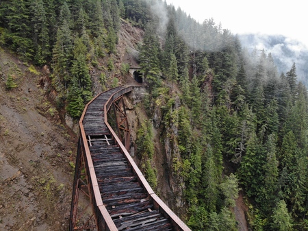 Wooden beams of a railway bridge or train trestle in the lush forest of Newberg, Oregon, USA.