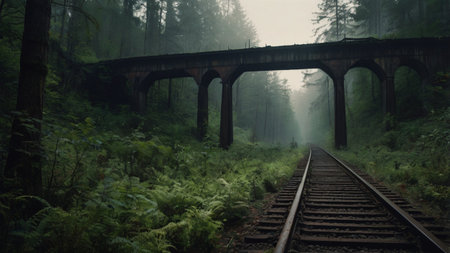 Railway bridge in the misty forest. Dramatic image.