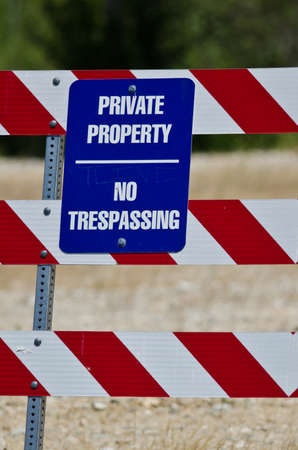 Close up of a Private Property No Trespassing sign on a sunny day. Vivid green grasses lit by sunlight grows on the terrain beneath the sign post.