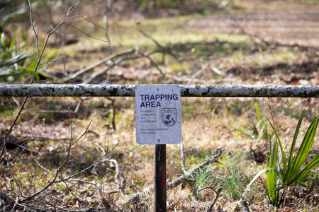 BAYOU COCODRIE NATIONAL WILDLIFE REFUGE LOUISIANA/USA – FEBRUARY 4 2022: Sign noting a trapping area at the Bayou Cocodrie National Wildlife Refuge