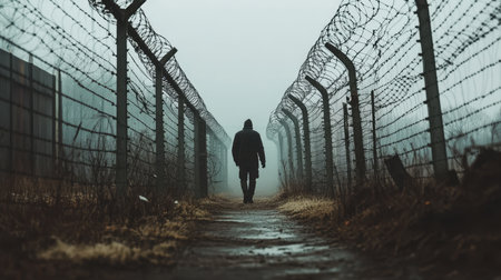Individual navigating a corridor surrounded by barbed wire fencing in a restrictive environment