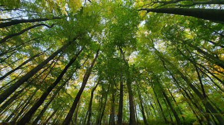Looking up at the tops of tall trees in the forest. Nature background
