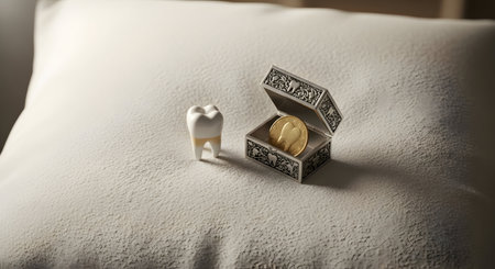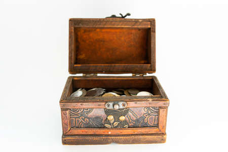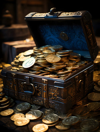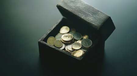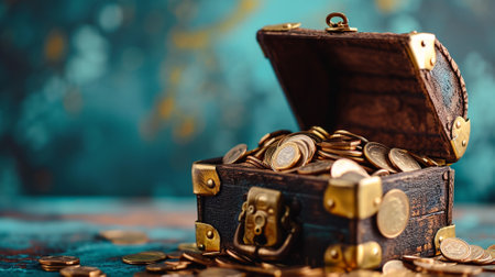 A vintage wooden chest filled with assorted coins, showcasing a mix of textures and metallic finishes, set against a dark, moody background.
