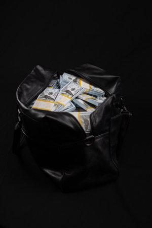 Vertical. A large bag full of money stands on a black background. There are stacks of hundred dollar bills in the bag. The concept of wealth, prosperity.