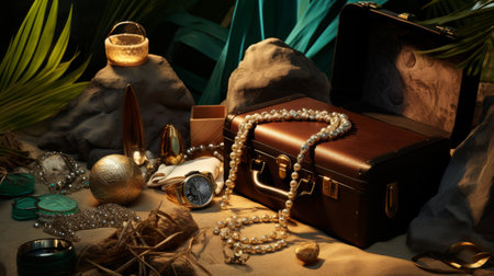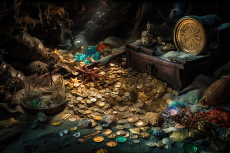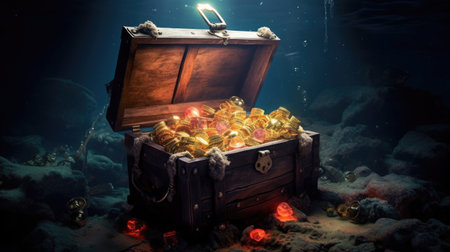 sunken treasure with coins and jewels spilling out onto the ocean floor, created with generative ai