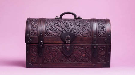 This image features an ornate antique wooden chest, showcasing intricate carvings and craftsmanship, set against a soft pink background. Ideal for vintage decor themes.