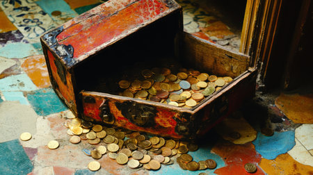 A vintage wooden treasure chest lies open, overflowing with gleaming antique coins scattered on a colorful mosaic floor, evoking a sense of history and wealth.
