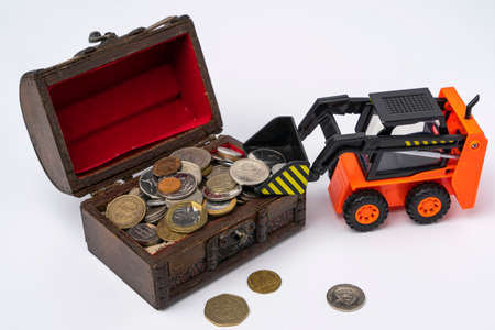 A small treasure chest full of coins on the table and blue background, safe assets in times of crisis or recession