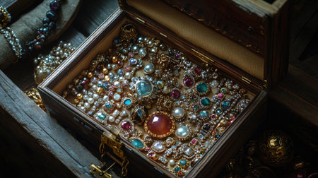 A beautifully crafted vintage jewelry box bursting with an array of colorful gems and intricate designs. This stunning collection represents timeless elegance and beauty.