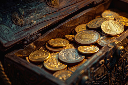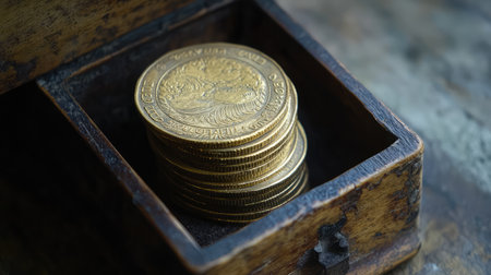 An antique wooden box holds a stack of gold coins with intricate engravings, creating an eye-catching visual ideal for finance, history, or vintage-themed content.