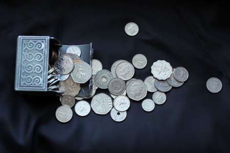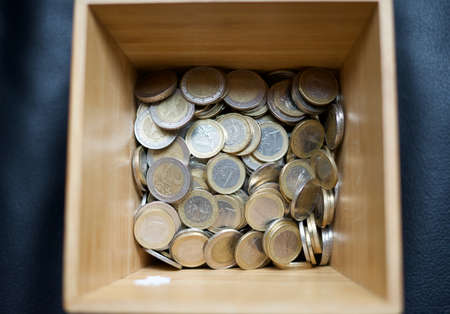 Box with euro coins. Collection of one and two euro coins. Moneybox. Concept of money and saving