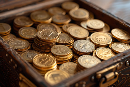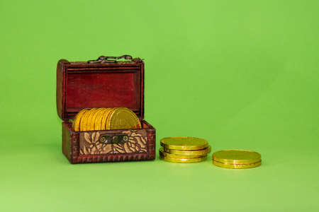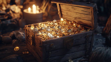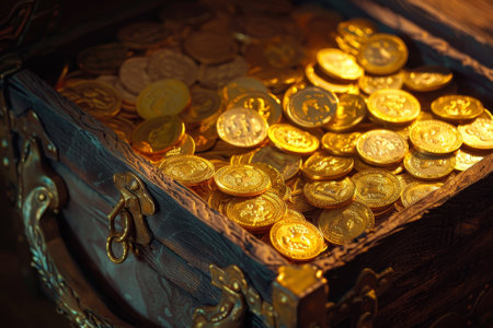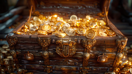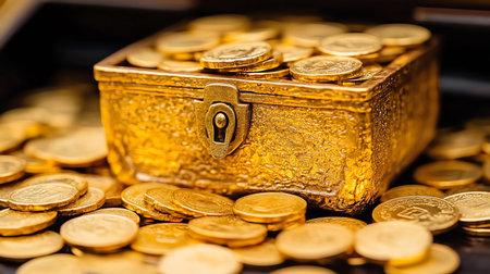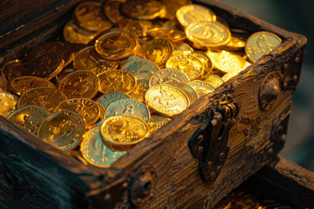 A wooden box filled with gold coins. The coins are of different sizes and shapes, and they are all shiny and golden. The box is open, revealing the treasure inside. Concept of wealth and abundance