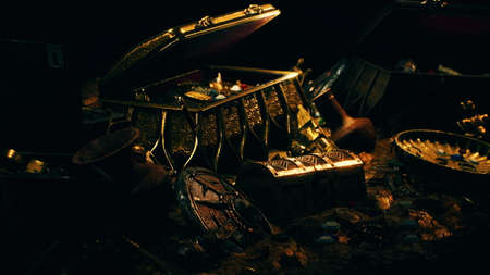 Treasure chest full of gold coins. Treasure concept. Selective focus.