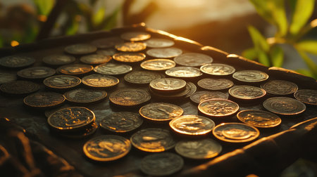 A captivating image showcasing golden coins resting on a textured surface with a shimmering background, evoking feelings of wealth and luxury against a warm, sparkling atmosphere.