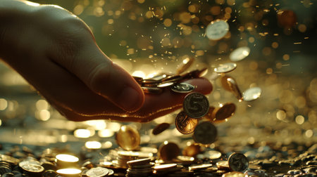 Close-up of a hand scattering coins, with a shimmering golden bokeh effect in the background, symbolizing wealth and abundance.