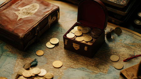 A vintage treasure chest filled with coins sits atop an old map, evoking themes of adventure and exploration. Perfect for travel and history enthusiasts.