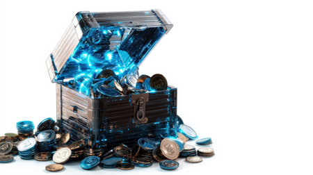 Treasure chest with blue neon glow, overflowing with coins, isolated on white, ideal for fantasy concepts
