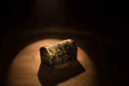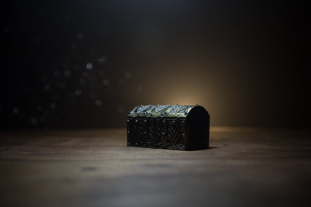 An antique treasure chest sits on a weathered wooden surface, illuminated by warm lighting. The chest, featuring metal accents and a secure lock, is the central focus. The composition includes a blurred background of soft, out-of-focus lights. This image is suitable for various commercial purposes, including historical themes or design elements.