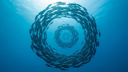 From the deep blue depths, a massive school of fish swirls in a unified vortex, their collective movement creating a mesmerizing pattern against the bright sun above. This powerful display captures the essence of teamwork, strategy, and the cyclical beauty of life in the vast ocean.