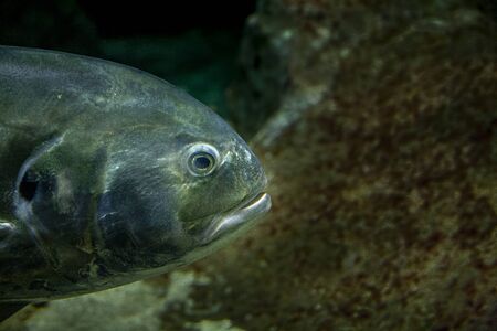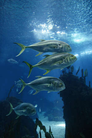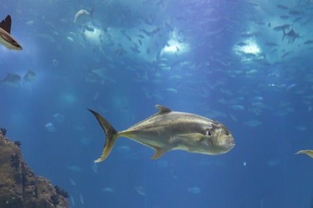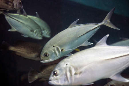 Crevalle jack silver fish. Caranx hippos or yellow cavalli swimming in aquarium